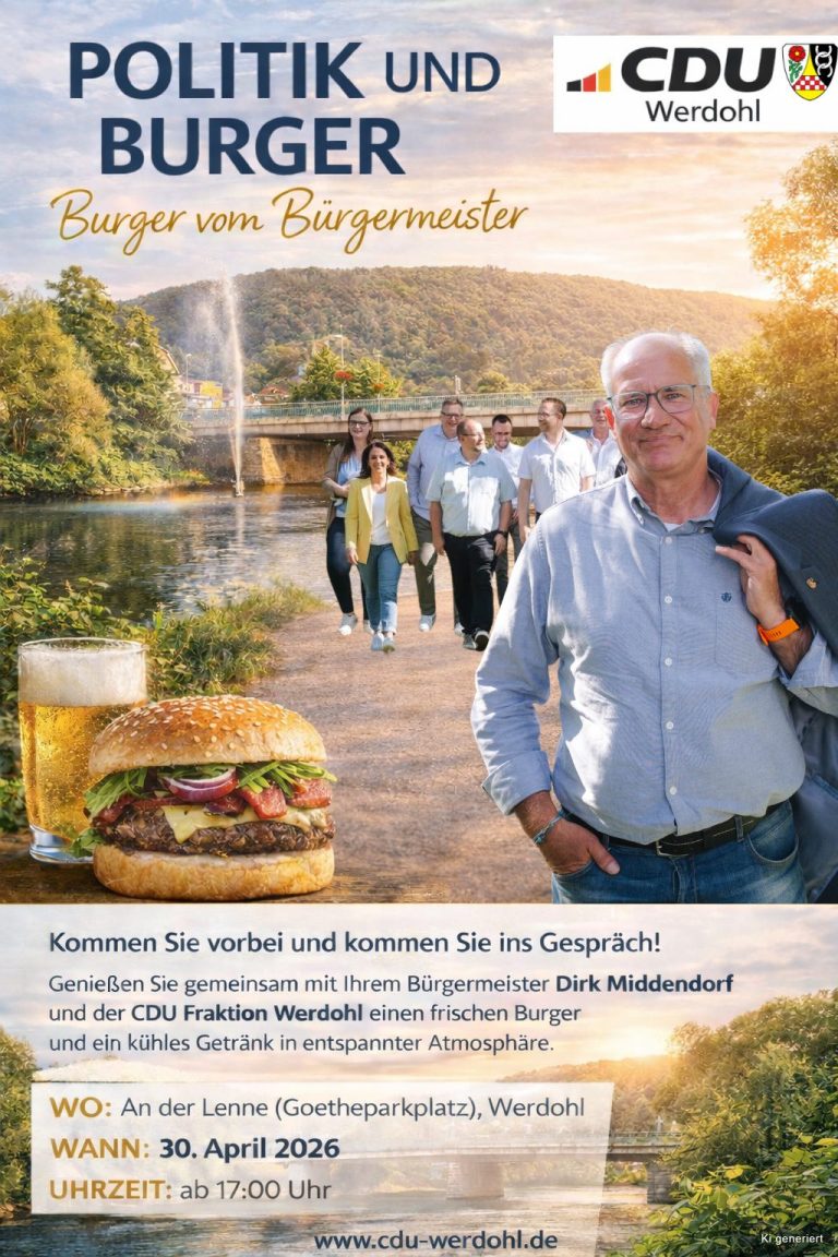 Gemeinsam mit unserem Bürgermeister Dirk Middendorf und der CDU Fraktion Werdohl laden wir dich herzlich ein, ins Gespräch zu kommen ganz unkompliziert bei einem frischen Burger und einem kühlen Getränk.